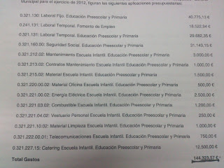 Aquestes són les aplicacions pressupostàries de l'ajuntament que van dirigides a l'Escola Infantil. Un total de 144.323,57€ (cal dir que, en la meua opinió, estan un poc unflades, però bé, ja parlaré més exhaustivament sobre això.